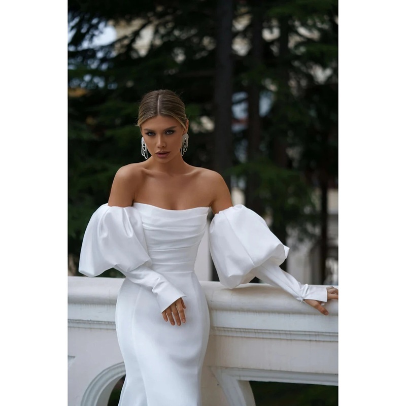 Hall Casual Wedding Dresses Mermaid / Trumpet Off Shoulder Long Sleeve Court Train Satin Bridal Gowns With Ruched Solid Color