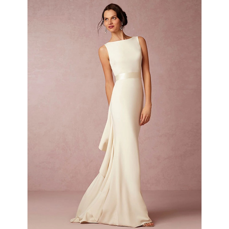 Hall Open Back Simple Wedding Dresses Sheath / Column Scoop Neck Sleeveless Sweep / Brush Train Fabric Bridal Gowns With Draping Summer Wedding Party