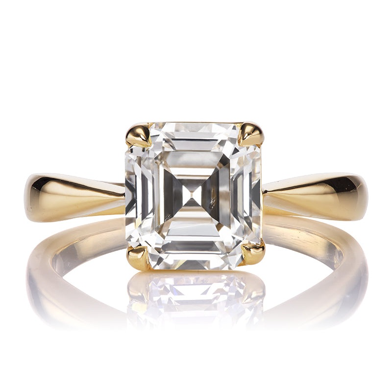 Classic 2.67 Carat Asscher Cut Diamond in 18kt Gold Solitaire SettingThe Hallie 2.67 ring is an AB original design made right here in NYC. The ring centers a GIA-certified 2.67-carat Asscher Cut diamond of K Faint Brown color, SI2 clarity. The stone is pro