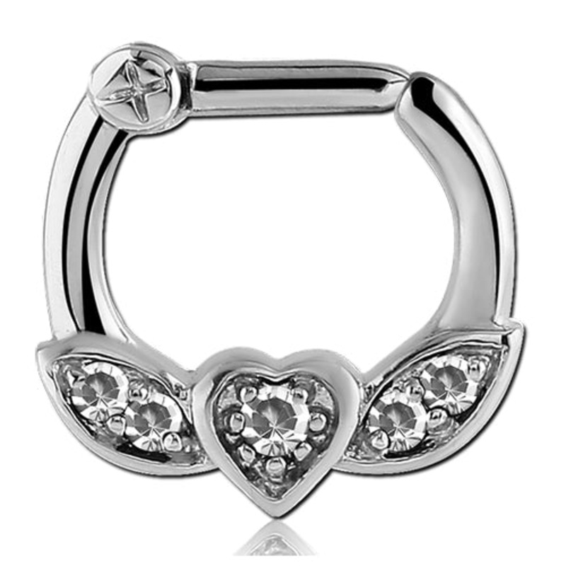 The 16 gauge heart flower septum clicker is made from 316L stainless steel. The 5/16" long barbell is hinged on one side and snaps firmly shut on the other. The interior diameter is measured inside the clicker from top to bottom.