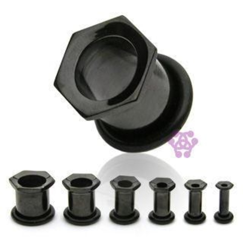 These single flare hex tunnels are made from black PVD coated 316Lsurgicalgrade stainless steel. They have a groove on the end that holds the o-ring more securely. Two black o-rings are included. Choose your size below.