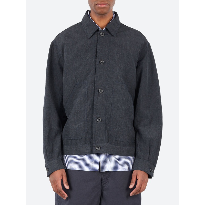 This loose-fitting short jacket features dropped shoulders and sleeves that are curved like an MA-1, adding a unique and stylish touch. It includes work-style pockets and subtle color stitching, enhancing its overall design. The outer material is a finely woven plain weave fabric made from yarn-dyed wool linen, crafted to the limit for a refined, textured finish.
