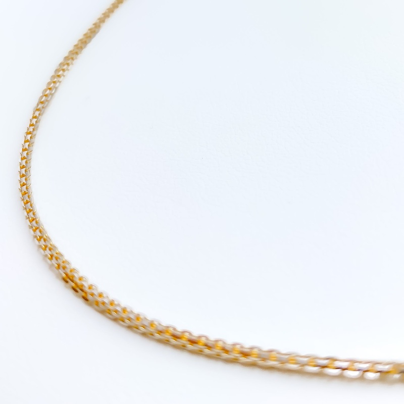 Indulge in sophistication with this stunning 22k gold chain, featuring a sleek slender square box design meticulously crafted to perfection. With a refined finish in yellow and white gold, this chain exudes elegance and versatility. Weighing 6.0 grams and measuring 18 inches in length with a width of 1.25 millimeters, it strikes the perfect balance between delicacy and substance. Secured with a lobster lock, it ensures both style and security. Crafted for those who appreciate understated luxury and impeccable craftsmanship, this chain is a timeless accessory that elevates any ensemble.