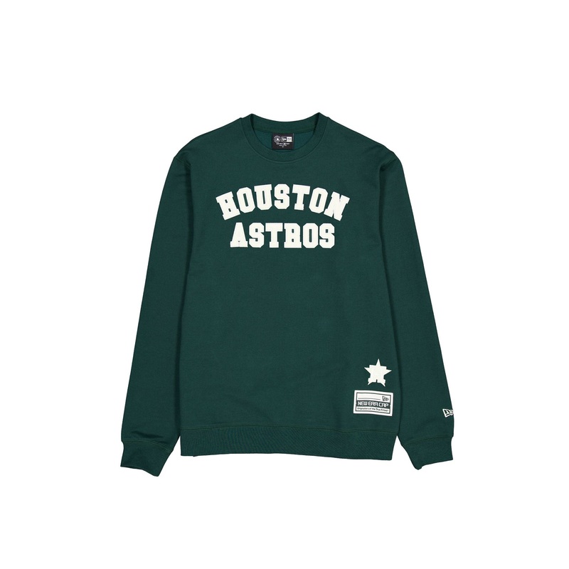 The Houston Astros Dark Green Logo Select Crewneck features a zig zag stitched twill applique Astros wordmark at the chest with an embroidered team logo above a woven tag at the left hip.