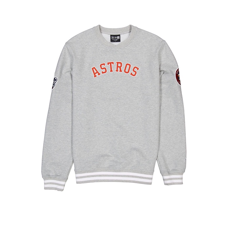 The Houston Astros Gray Logo Select Crewneck features an embroidered Astros wordmark at the front panels with a matching team logo patch at the left arm and a 2017 World Series patch at the right arm.