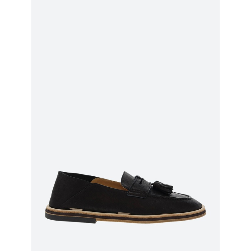 Handsewn loafers in brush off cow skin, calf lining and handmade leather outsole with anti-slip rubber island.Slip-on styleStitched saddle strapTassel detailMoc toe stitchingAlmond toeMaterialsUpper: leatherLining: leatherOutsole: leather and rubberMade in
