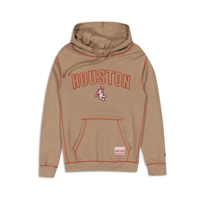 The Houston Rockets 2023 City Edition Tan Hoodie features a mesh applique Rockets wordmark and embroidered team logo at the chest with a team jock tag at the kangaroo pocket.