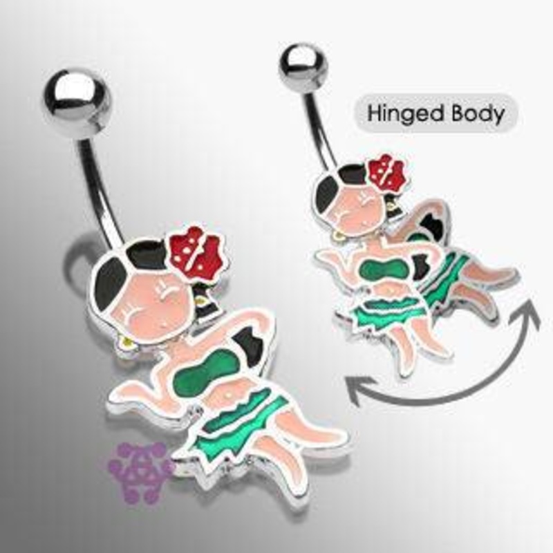 The 14 gauge hula girl dangle belly barbell is made from externally threaded 316L stainless steel. Only the 5mm ball end is removable.