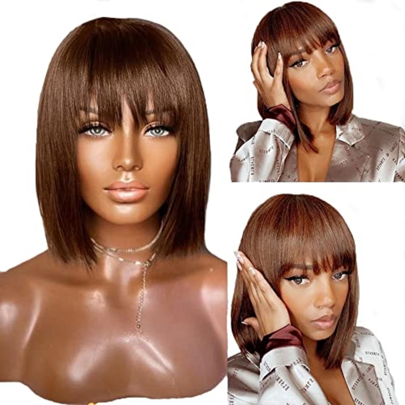 Human Hair Light Yaki Straight Bob Wig with Layered BangsThis gorgeous 100% unprocessed Brazilian Remy real human hair machine-made bob wig features a unique 2x1 HD lace for naturally super-realistic styling. It's 8-14" and comes in a rich chocolate dark b