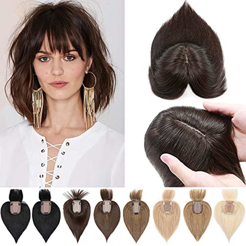 Introducing our Human Hair Blend Hair Topper with Bangs! This topper is specially designed for people in the beginning or middle stages of hair loss, or for anyone looking to hide thinning areas on their head. It is a perfect blend of 50% real human hair and 50% heat-friendly fibre, allowing it to be styled like your own hair; wash, straighten, curl, bleach or dye. It has a natural-looking silk base, making it look just like a real scalp, and 150% density crown toupee with 4 anti-slip clips that provide secure yet comfortable attachment all day long. The texture is straight, it also comes in lengths ranging from 6-18 inches, with a base size of 7cm x 13cm (2.7×5.1 approximately). Cut or curl the bangs to any style your like to fit your face. Please note that colors might be slightly different from the picture shown considering light and different monitor. Get the perfect look with this fantastic Human Hair Blend Hair Topper with Bangs and hide any of your thinning areas instantly.