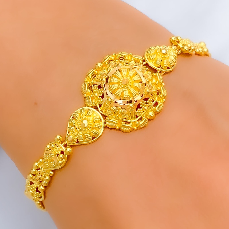 Crafted for effortless sophistication, this 22K gold bracelet radiates charm with its sleek yellow gold finish. Weighing 7.3 grams, it offers a refined yet lightweight feel, perfect for any occasion. The 7.1-inch length, enhanced with 0.7-inch adjustable links, ensures a comfortable and customizable fit. Secured by a classic hook lock, this timeless piece blends elegance and versatility, making it an essential addition to any jewelry collection.
