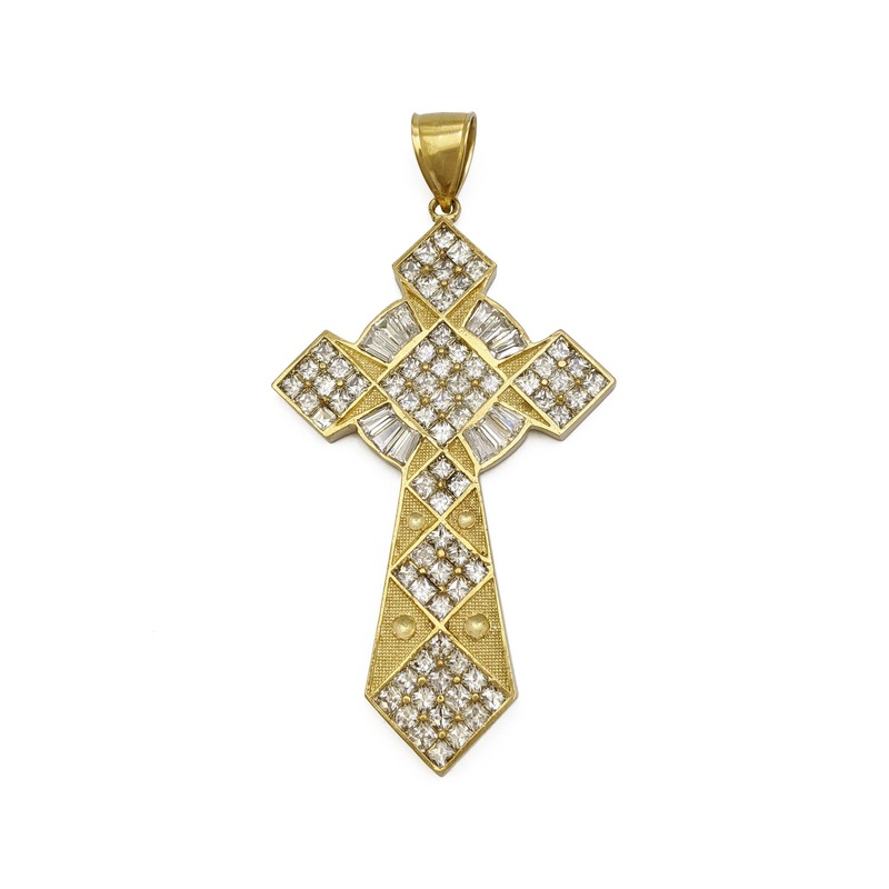 Precious Metal: 10 Karat Yellow GoldGemstones:Cubic ZirconiaPrincess-Cut and Baguette Shaped: WhiteStones may be upgraded upon requestHeight: 90.45 mm* (3.56 inch)Width: 46.9 mm*(1.85 inch)Thickness: 4.15 mm*Approx. Weight: ~24.5 grams**All weights and mea