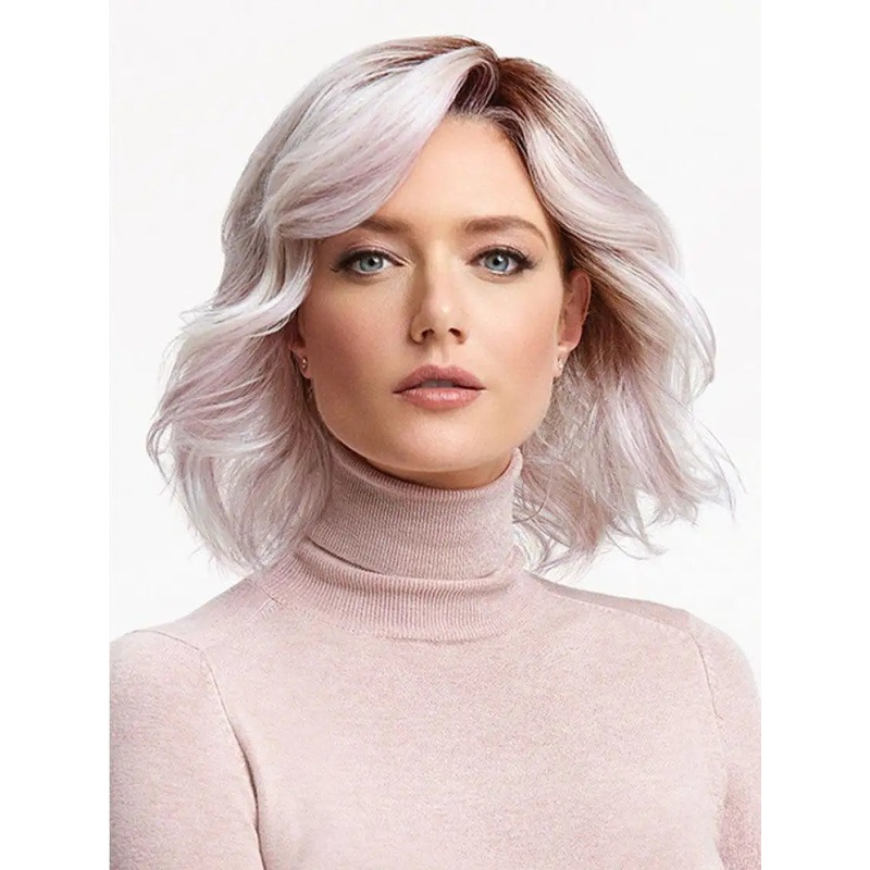 If you Dare WigDare to turn heads in a sophisticated and on-trend look. The If you Dare Partial Monofilament Wig is an above-the-shoulder layered bob is loaded with wave and curl. The light lavender tone puts you at the forefront of modern hair with a root