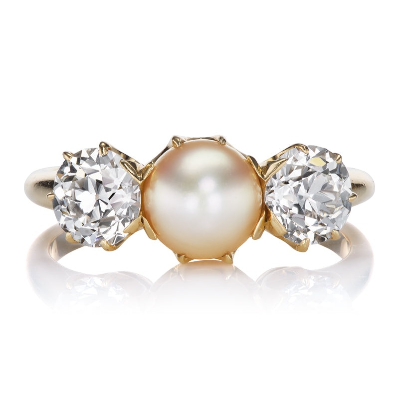For the feminine girl who loves the land and sea- a timeless pearl and diamond three stone ring that can be worn on any finger! This historic treasure glistens and glows and pairs beautifully with bands.