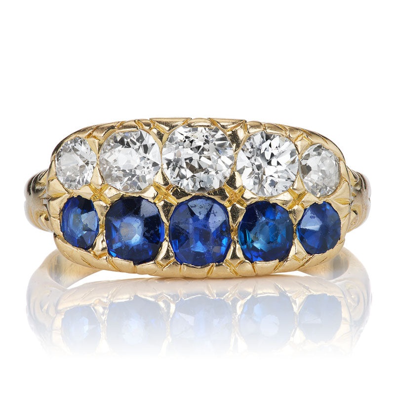 TheImola ring is an authentic vintage diamond and sapphire ring from the EdwardianEra circa 1901. The ring features one row of five Cushion Cut sapphires and one row of five Old European Cut diamonds of approximately J-K-L color and totaling approximately 0.75 carats. The stones are set in an 18kt yellow gold setting. The ring is currently sized slightly over a 6.25 and can be resized!