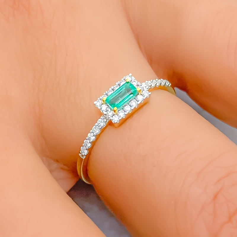 This 18k gold ring features an imperial glowing design, perfect for adding elegance to any outfit. Weighing 1.1 grams, it showcases a yellow gold finish that enhances its sophisticated look. The ring is adorned with a 0.11ct round brilliant cut diamond of G-H color and VS quality, along with a 0.13ct cultured emerald in a baguette shape. Sized at 5.25, with resizing available, this ring combines the brilliance of diamonds with the vibrant allure of an emerald. Certified by GGL, it brings a touch of luxury and trendy charm to your jewelry collection.