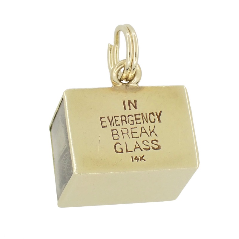 Certain to attract a second glance, this lustrous IN EMERGENCY BREAK GLASS charm measures 7/16 inch wide by 9/16 inch high and features a 14K yellow gold split ring bail that makes this mad money dollar charm perfect to wear on a favorite neckchain or easily and securely attaches it to a charm bracelet.
