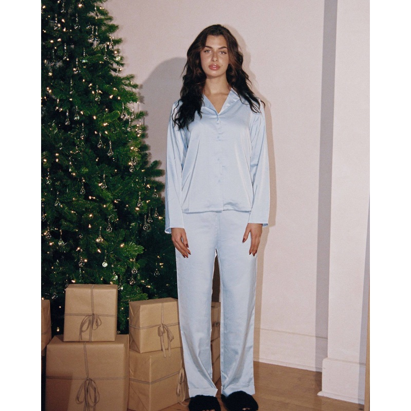Our satin inspired pants has the cutest details. It offers a small elastic waistband. Versatile and chic, these pants are perfect for a luxurious night's sleep or for lounging in style.DetailsMaterial: 97% polyester and 3% spandexColor: Baby blueModel heig