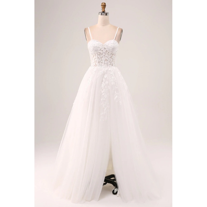 Ivory A-line thin shoulder strap tight fitting corset lace sheer long wedding dress