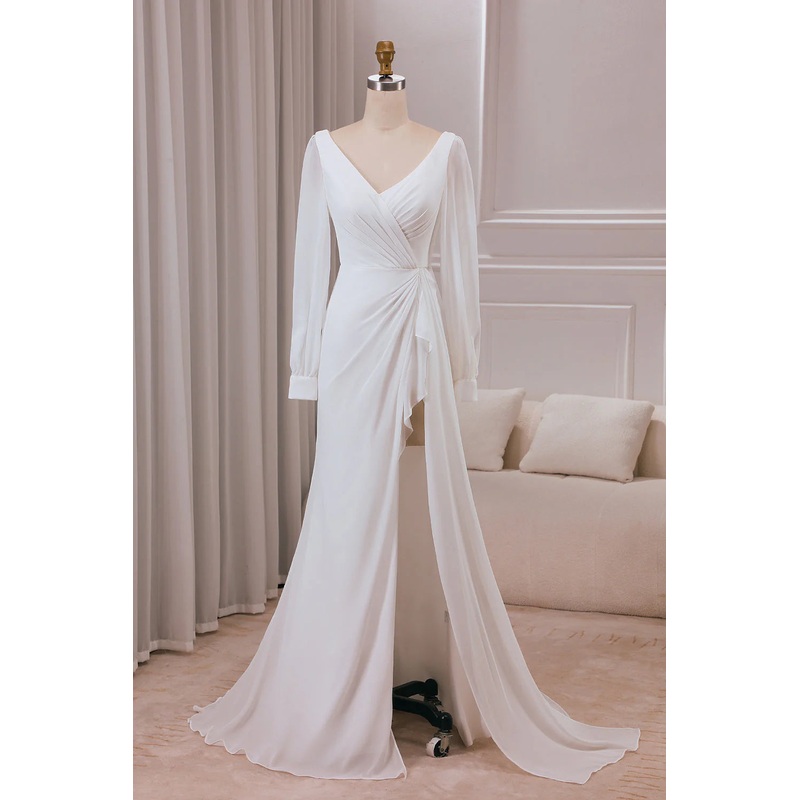 Ivory V-neck long sleeved A-line chiffon and floor length wedding dress
