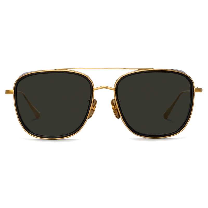 The Linda Farrow // Jarvis embodies intricate craftsmanship in a complex in-house design, meticulously crafted from Japanese titanium. Available with either 22-carat gold or matte nickel color plating, these sunglasses exude luxury and sophistication. Pair