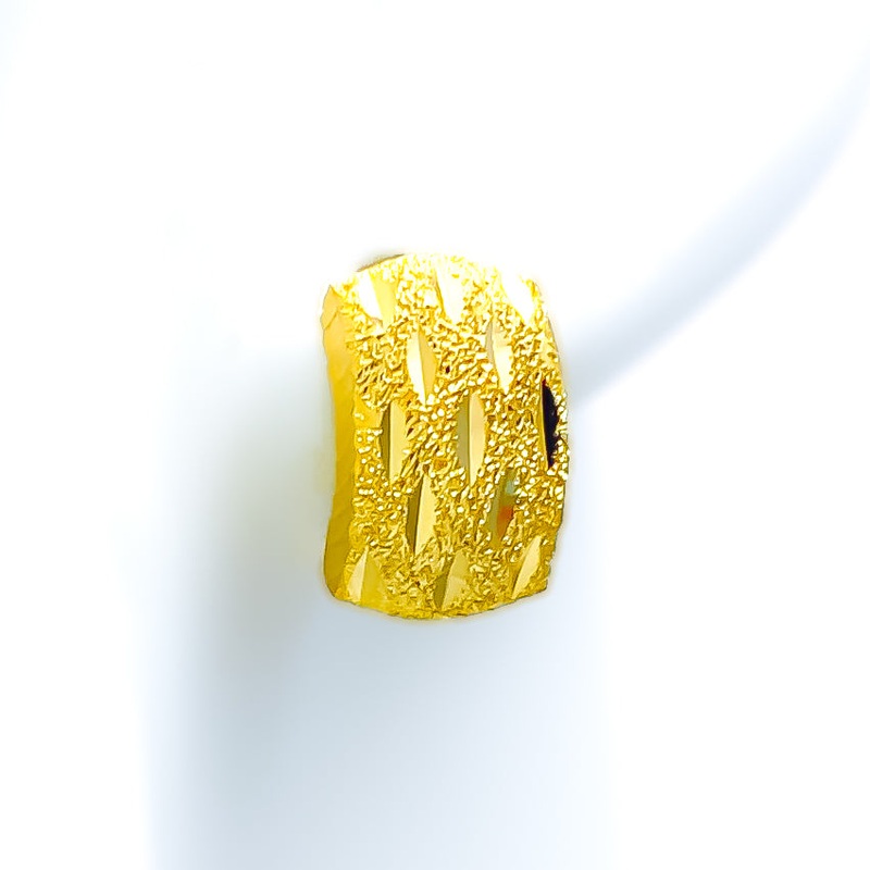 These 22k gold earrings, weighing 2.8 grams, feature a jazzy and artistic design that exudes elegance and sophistication. The yellow gold finish enhances their luxurious and radiant appearance. Measuring 0.6 inches in length, these tops-style earrings are