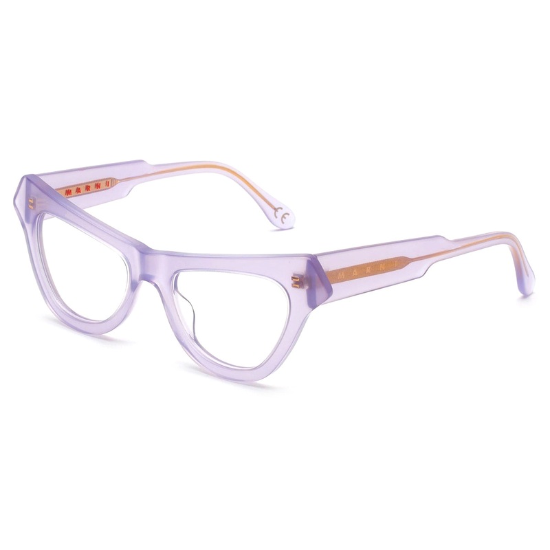 Designed exclusively for Marni, Jeju Island is a bold optical frame characterized by a chunky acetate construction and sculpted rims. The model is a unique reinterpretation of cat-eye shapes, with triangular lenses and a pointed front. The unique v-shaped