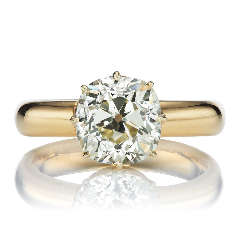 TheJessering is a newly made ring centering a diamond from the Victorian Era. The ring centers a GIA-certified 4.29-carat Old Mine Cut diamond ofU-V color,VS2 clarity. The stone is set in an 8-prong 18kt yellow gold setting. The ring is currently size9 and can be resized!