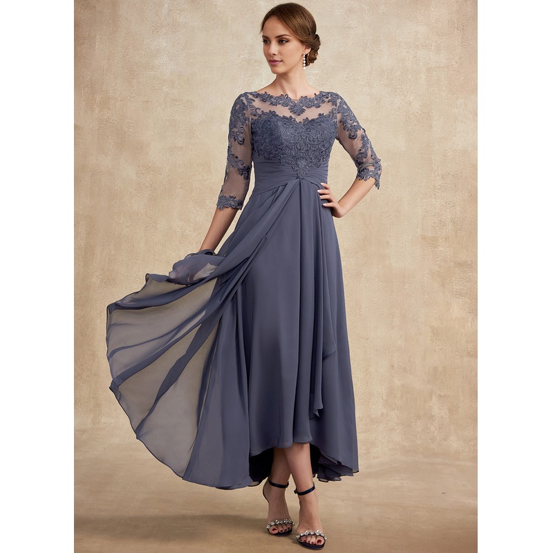 Jimiss A-line hollow illusion asymmetrical lace chiffon belt with layered ruffles mother of the bride dress