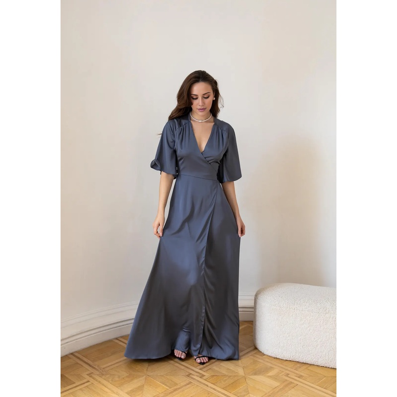 Jimiss deep V-neck short sleeved satin slit and floor length Prom dress