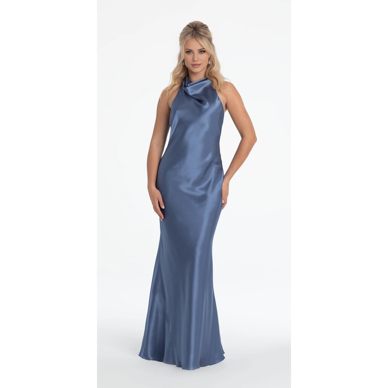 Jimiss halter neckline satin sleeveless off shoulder and floor length Prom dress