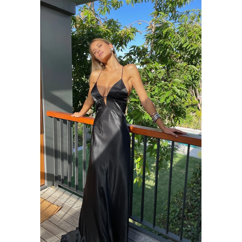 Jimiss minimalist A-line thin shoulder strap black long Prom dress