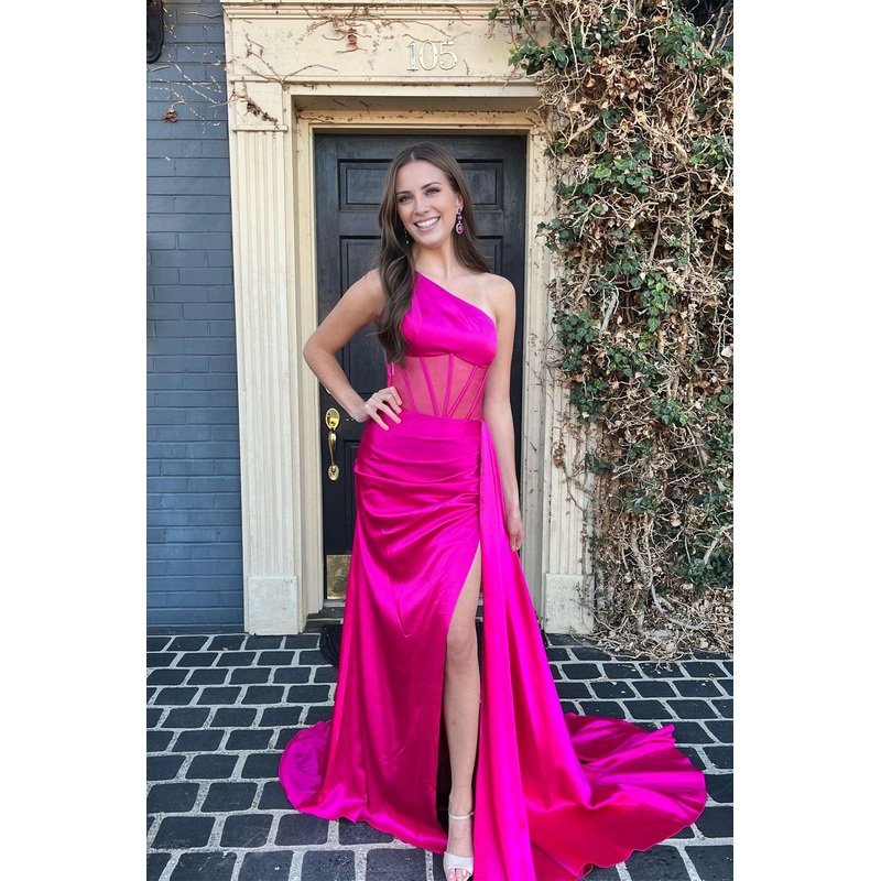 Jimiss One Shoulder Hot Pink Split Mermaid Long Prom Dress