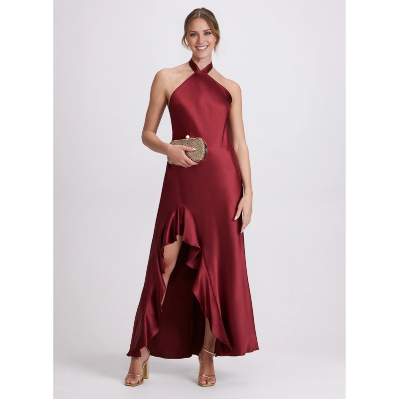 Jimiss satin hanging neck sleeveless ruffle edge slit long Prom dress