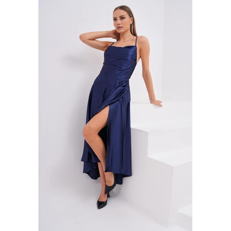 Jimiss - satin pleated thin shoulder strap backless long Prom dress