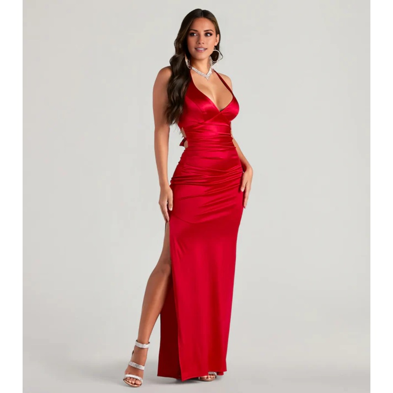 Jimiss V collar satin side slit backless and floor length Prom dress