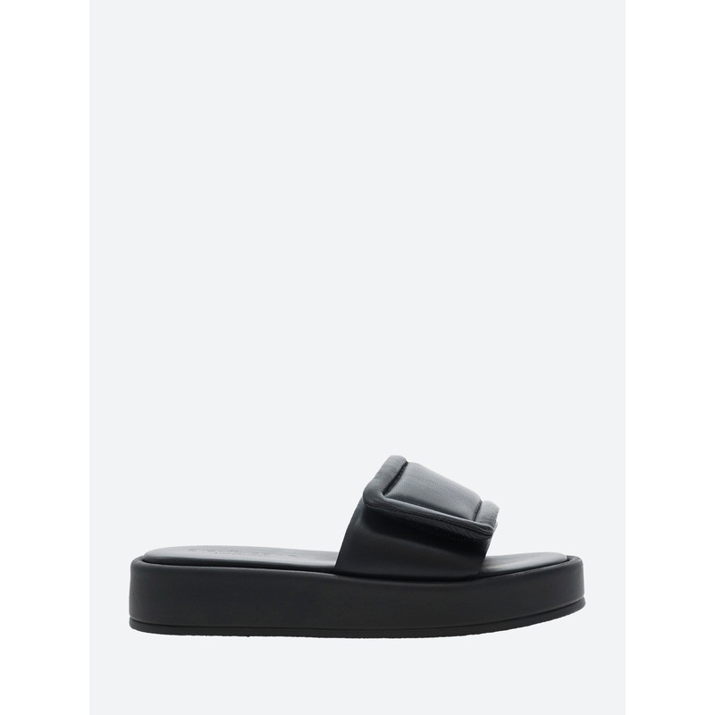 gravitypope Jody slide sandals with a wide, padded strap across the vamp. Sits on a leather covered wedge.