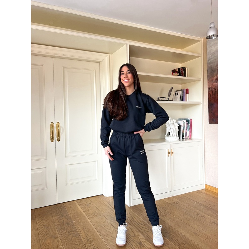 Pantalon jogger de tiro alto con goma en la cintura ajustable con cordon. Bolsillos laterales y goma en el tobillo. Detalle de logo SORELLAS THE BRAND bordado en azul marino en el bolsillo lateral .Sudadera a conjunto disponible.Tallas XS (34/36) , S (36/3