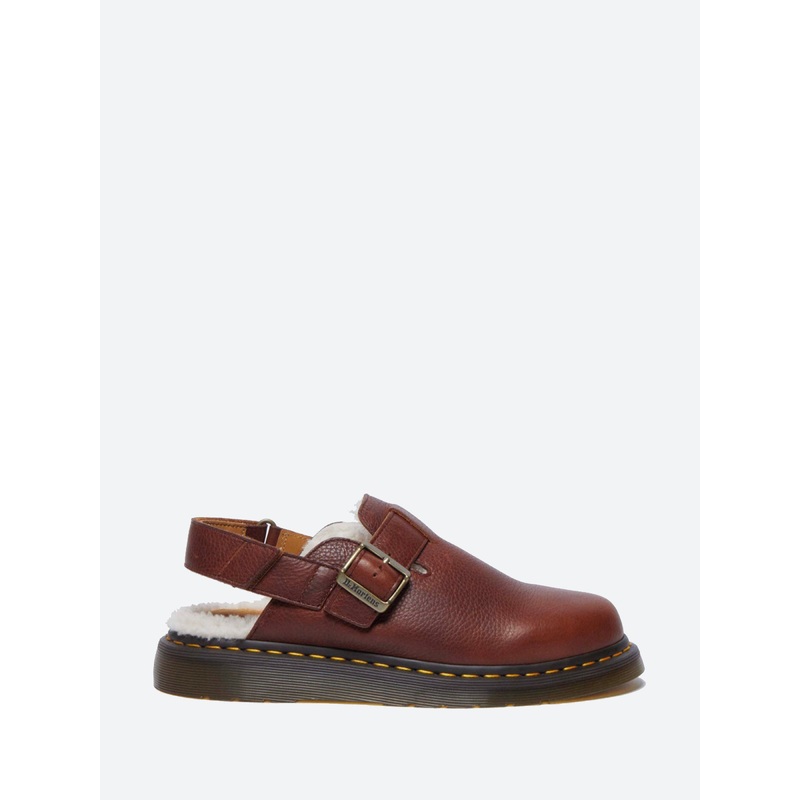 Dr. Martens Jorge II is a timeless slingback mule made with their tumbled Ambassador oiled brown leather, lined with borg faux fur.Slingback muleAdjustable buckle fasteningSignature welt stitchAirWair soleGoodyear weltedFaux fur linedMaterialsUpper: leathe
