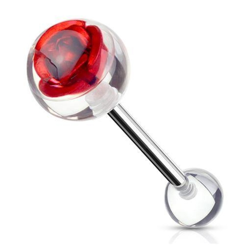 The rose tongue barbell is made from 316L stainless steel with external threading. The metal rose is encased in a smooth acrylic dome. The 14 gauge straight barbell is 5/8" long with 5 and 8mm balls. Choose your flower color below.