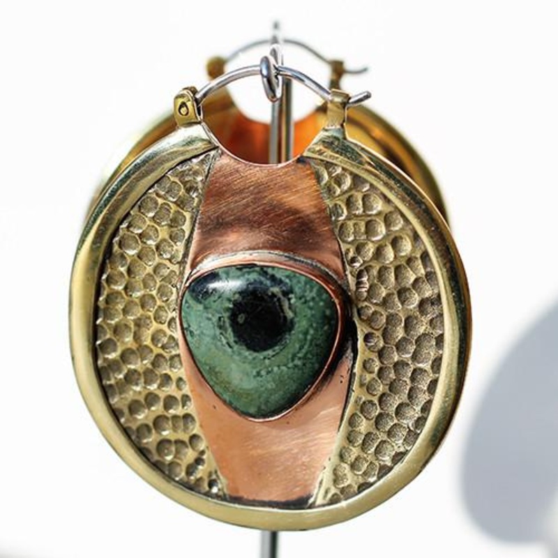 These kambaba jasper fusion orbitearringsare cast from solid copper and yellow brass by Oracle Body Jewelry.Dimensions: 58mm high X 52mm wideWeight: approximately 30.3 grams each piece