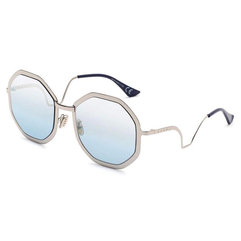Designed exclusively for Marni, Kamioka Mine is a playful all-metal silhouette characterized by an oversized fit and a geometric shape. The model features octagonal rims encasing wide lenses for extra coverage during sunny winter days. The unique thick metal construction features a lowered nose-bridge and curved temples, ushering in a new era of metal sunglasses. Includes Marni box, case, and a cleaning cloth.