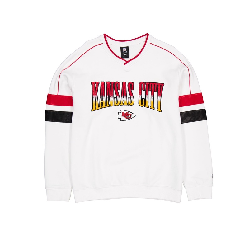 The Kansas City Chiefs Sport Classics White Crewneck features a satin Chiefs wordmark appliqu and an embroidered logo at the front with satin sleeve stripes.