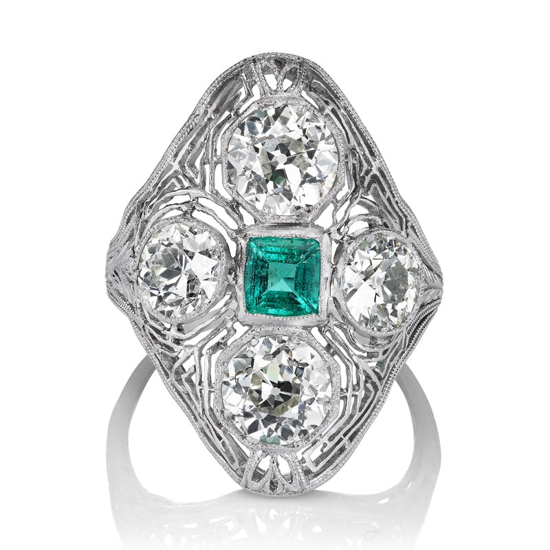Four shimmery antique diamonds and a perfectly hued emerald center make this antique a piece to not be missed. We love her intricate, antique carvings and negative space for a delicate, yet statement feel.