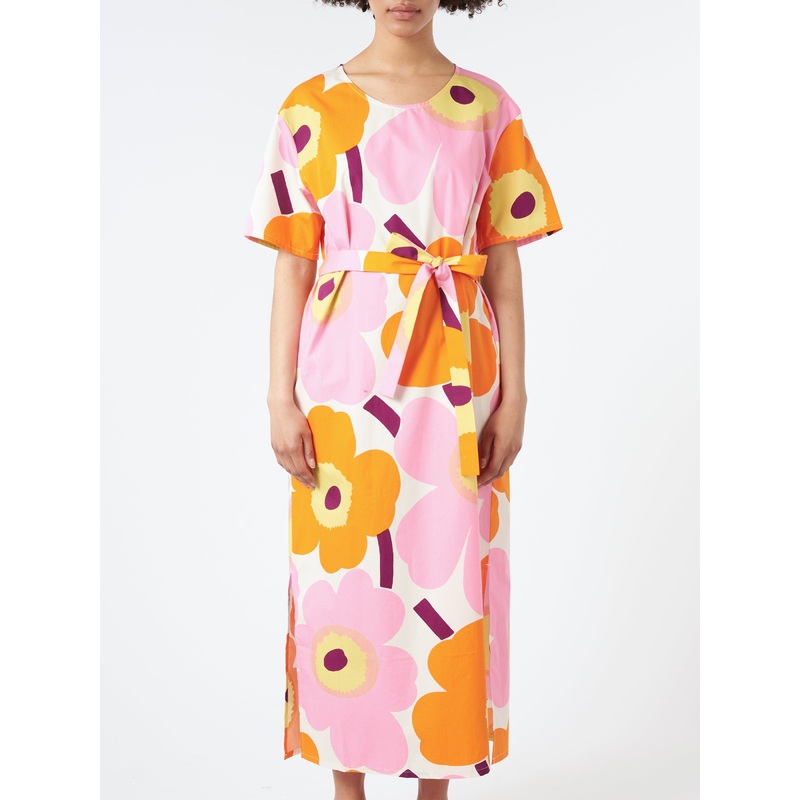 The Kemut dress is made of organic cotton poplin, and it has a relaxed, straight fit. The dress features the Unikko pattern, which is printed in Helsinki.Round necklineLoose, elbow-length sleevesBelt loops at the backSide seam pocketsSide slits at the hemM