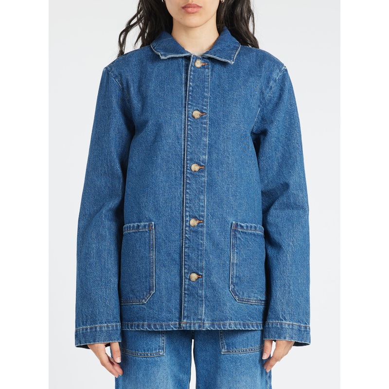 Workwear jacket in stonewashed indigo Japanese organic cotton denim.Classic collarFront button closureLong sleevesTwo pockets at the bottom of the jacketTone-on-tone embroidered logo at the left pocketUnlinedStraight cutMaterialsFabric Content: 100% organi
