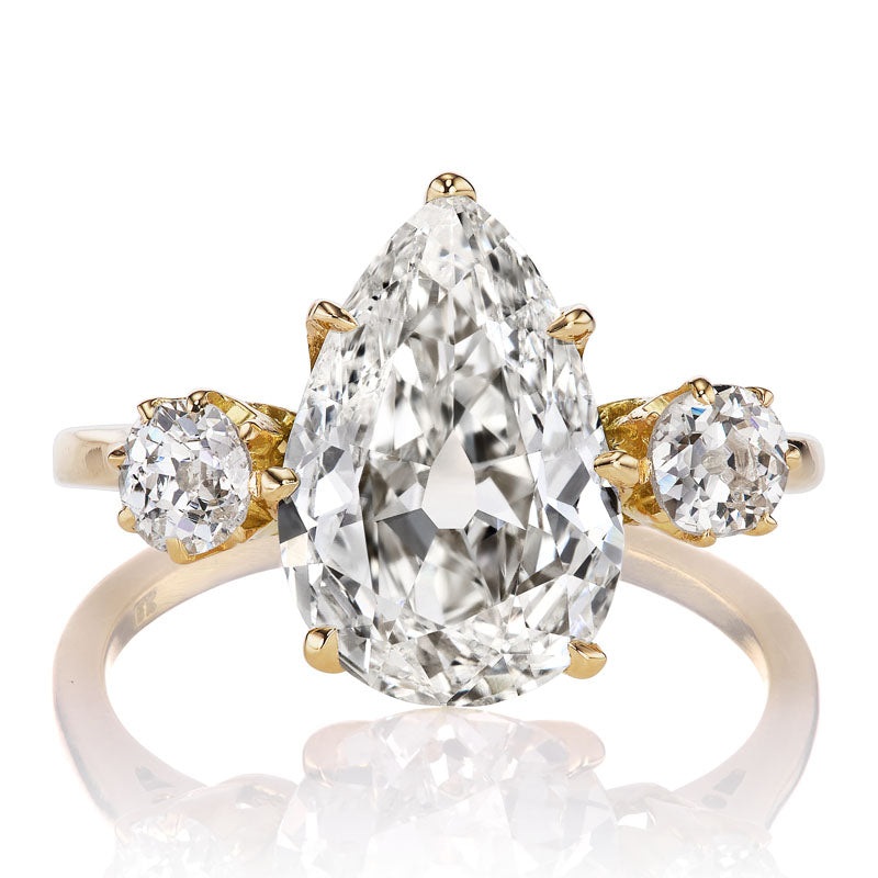 TheKiara 3.01 ring is an AB original design made right here in NYC. The ring centers a GIA-certified 3.01-caratPear Shape diamond ofJ color,SI1 clarity. The stone is set in a7 prong 18kt yellow goldsetting. An old European cut diamond of coordinating color and clarity is set to either side of the center stone combining for 0.45-carats. The ring is currently size6 and can be resized!