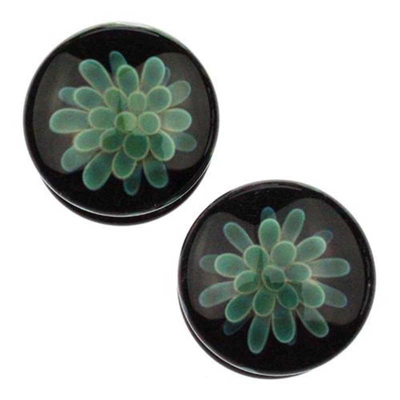 These double flare koosh plugs are made from hand blown borosilicate glass by Glasswear Studios. They have a wearable area of approximately 3/8" between flares. They can be worn backwards to show the plain glossy black side. Choose your size below.