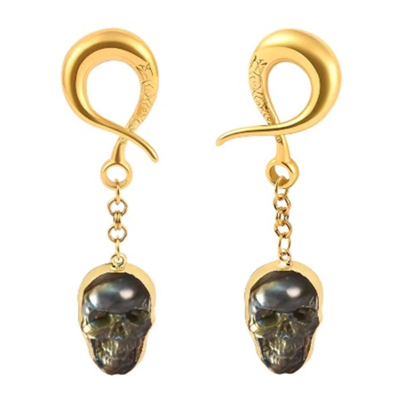 These 2g labradorite skulls are suspended from gold PVD coated 316L stainless steel coils.