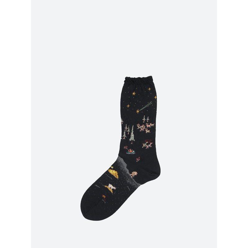 Antipast crew length socks knitted in a fine gauge blend with reindeer and winter-inspired elements.Crew lengthRuffled cuffsJacquard illustrations of reindeer, trees and outdoor elementsTonal heel and toeMaterialsFabric Content: 70% wool, 30% nylonMade in